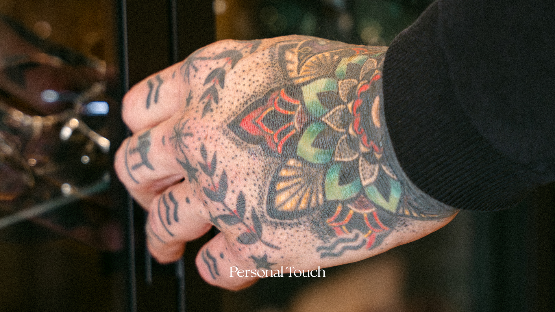 • Close-up of a tattooed hand adjusting guitar tuning pegs. The tattoo features a colorful floral and geometric pattern. The person is wearing a black long-sleeve shirt or jacket. Text overlay reads 'Personal Touch'.
